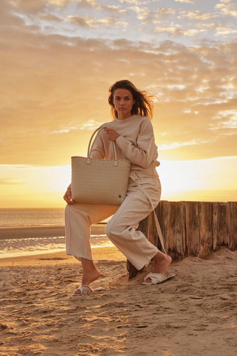 Entdecken Sie die ‚DUNE‘ Shopper-Tasche. Eine schlanke Handtasche mit einem raffinierten, wellenförmigen Flechtmuster, das von der natürlichen Bewegung der Dünen inspiriert ist. Obwohl die ‚DUNE‘ schlank aussieht, bietet sie überraschend viel Platz für alles, was Sie brauchen. Die ‚DUNE‘ hat robuste, kurze Griffe, mit denen sie schick in der Hand getragen werden kann. Im Inneren der Tasche befindet sich ein Ring, an dem Sie Ihre Schlüssel befestigen können, sodass Sie nie wieder nach ihnen suchen müssen. Die ‚DUNE‘ ist in hellen Farben erhältlich. Handgeflochten aus recyceltem Kunststoff.